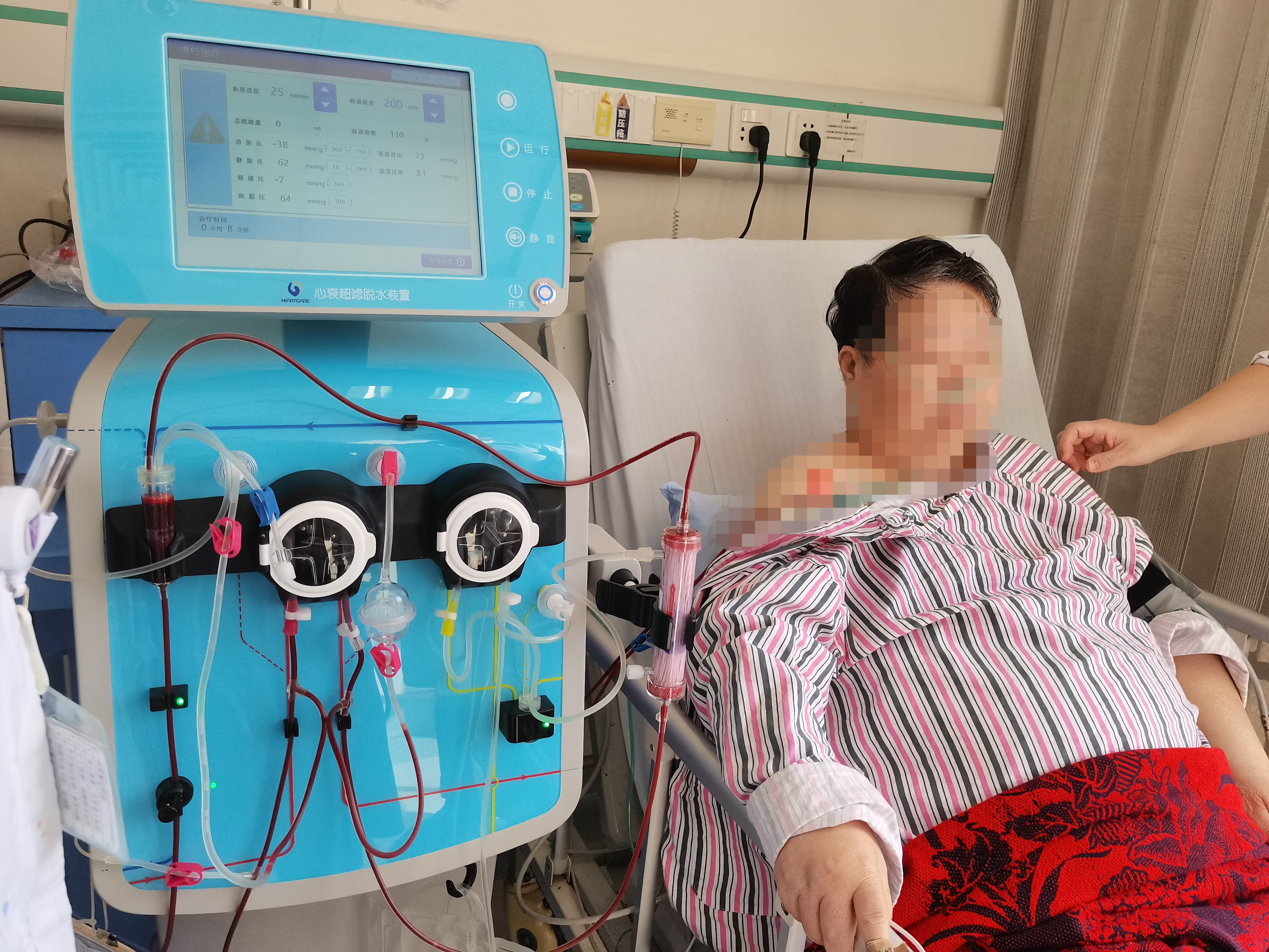 医护人员通过穿刺中心,静脉将血液先抽出,经过特殊过滤设备走行一圈,在这一过程中将血液里多余水分和钠盐清除出去,最后再将血液送回体内。在经过5-6次的心衰治疗后,共滤出多余的液体8000ml,吴阿姨胸闷气急症状明显改善,胸水明显吸收,下肢肿胀也显著消退,其体重从82公斤下降到了78公斤,更加令人欣喜的是,经过滤过治疗使得吴阿姨肌酐指标(评价肾功能的指标,越高越差)下降,表明肾功能又有所恢复,吴阿姨和家属对治疗非常满意,且对心衰超滤治疗新技术频频称赞。
