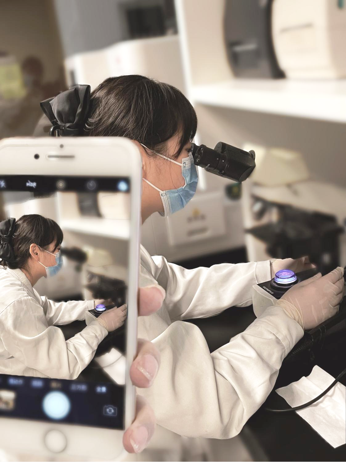 ▲检验科王佳琦正以专注的神情查看微观镜像中的检验物,各种细胞、杂质、粘液丝纵横交错,像极了一幅优美的素描画。她的专注和认真,完美体现了检验科对每一份标本检测结果的严谨要求。