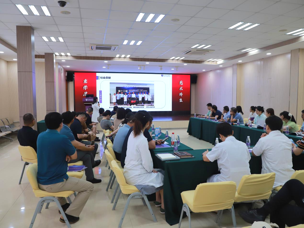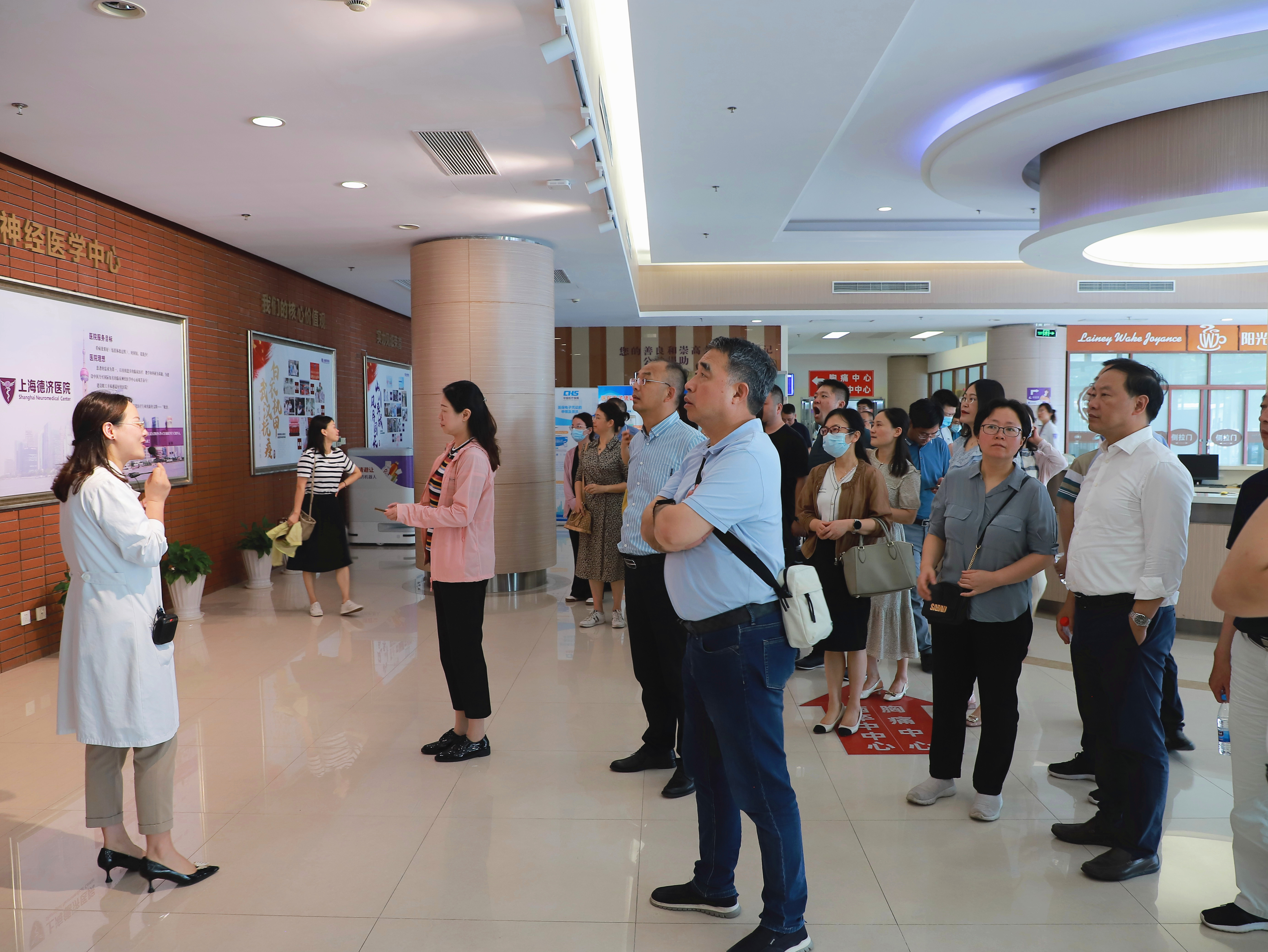 8月16日上午,在上海交通大学国际与公共事务学院的组织下,扬州市卫健委、苏北人民医院、扬州大学附属医院、市二院、市中医院、市三院、五台山医院、市疾控中心、市卫监所、市血站、市急救中心等机构领导干部一行52人莅临上海德济医院/青岛大学上海脑科医学中心进行考察交流。