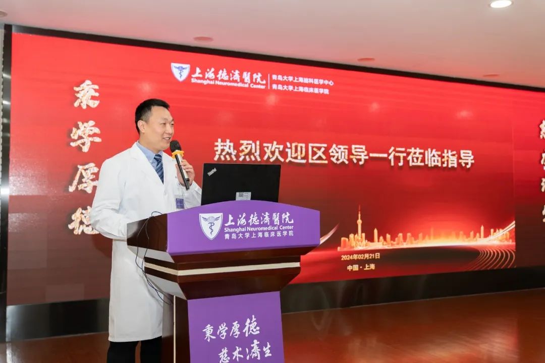 院长郭辉教授代表德济医院全体职工,对区领导的到来表示热烈欢迎,并向区政府长期以来对医院发展的关心和支持致以衷心的感谢。他介绍道,得益于区政府的正确领导与大力帮助,德济医院建设了超过日本静冈国立癫痫病医院的亚洲第一规模的神经电生理中心和癫痫中心,手术量比肩世界闻名的加拿大蒙特利尔神经医学中心。此外,德济发表的国际SCI论文,其影响因子五年来一直保持着上海市领域内的最高纪录。德济医院还在上海市和华东六省率先开展脑外科机器人手术,开启了神经外科机器人手术的新纪元。德济医院将继续保持神经学科的顶尖实力,不断提升医教研整体水平,最终实现建设卓越三甲脑科医学中心的工作目标,从而更好地为普陀人民健康保驾护航。