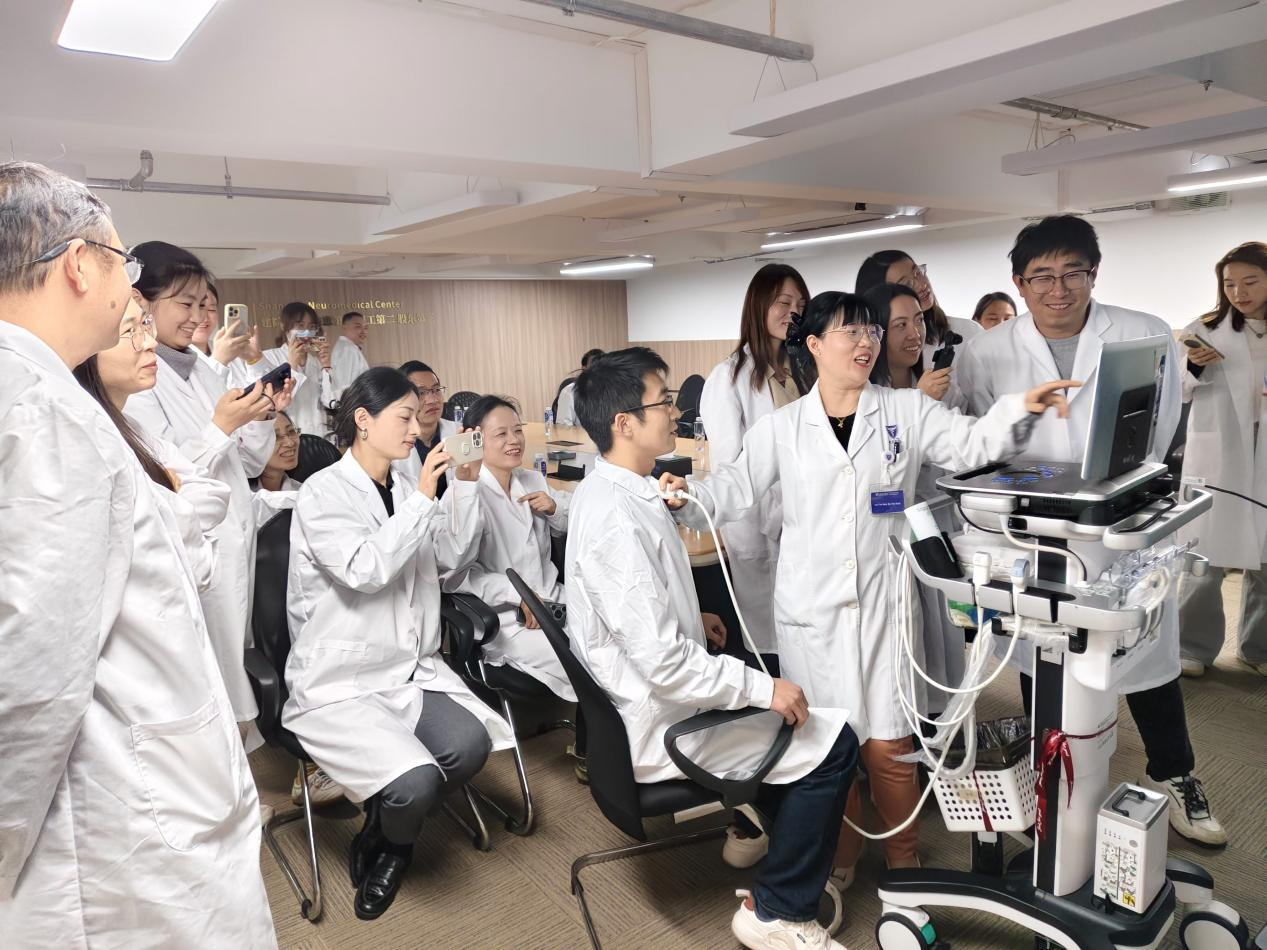 ▲超声科主任谢瑜娟为学员现场检查甲状腺