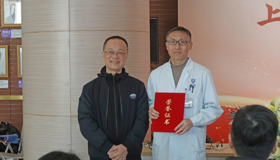 ▲刘晔翔主任将证书送到上海德济医院副院长、硕士研究生导师、检验科主任张振教授手中。